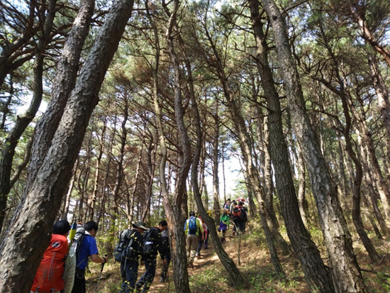 여원재에서 단체 사진을 찍고 모두들 즐거운 마음으로 산행을 시작한다. 2주 전 첫 구간 산행 때와 마찬가지로 이날도 소나무 숲이 우리를 반긴다. 저마다 이구동성으로 이렇게 울창하고 긴 소나무 숲은 처음 만난다고 말한다.