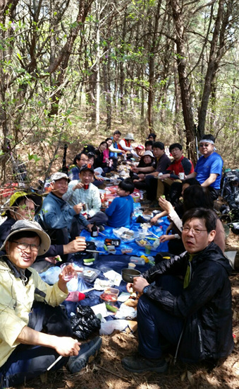 편안한 숲길이 계속 이어지는데 벌써부터 초여름 같이 날씨가 덥다. 아침식사를 안했는지 누군가 배고프다고 한다. 고남산에 오르기 전 그늘진 적당한 곳을 찾아 식사하기로 하고 자리를 잡았다. 오늘 접심식사의 백미는 홍어회. 변광무 대원이 멋진 술안주를 힘들게 지고 왔다.