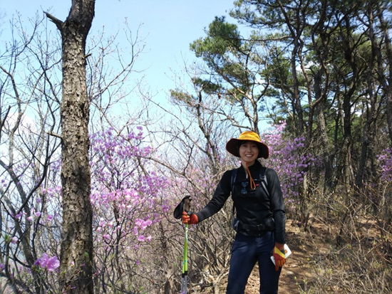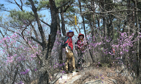 식사 후 고남산을 향해 출발. 고남산 정상 직전 계단을 오르니 진달래가 활짝 피어 있다. 소나무와 진달래가 어우러진 풍경이 그림 같다.