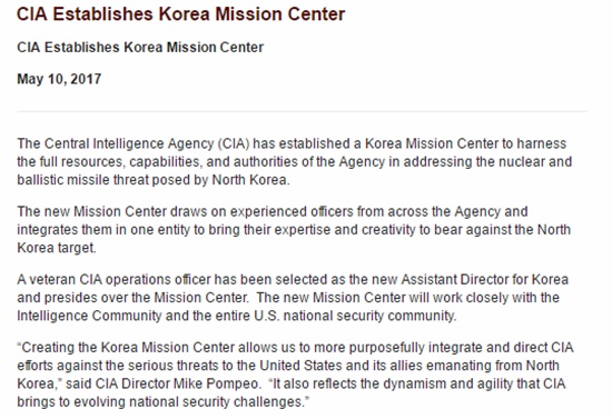 미국 중앙정보국(CIA)이 10일(현지시간), 북한 핵.미사일 위협에 대처하기 위해 ‘코리아 임무 센터’를 설치했다고 발표했다.