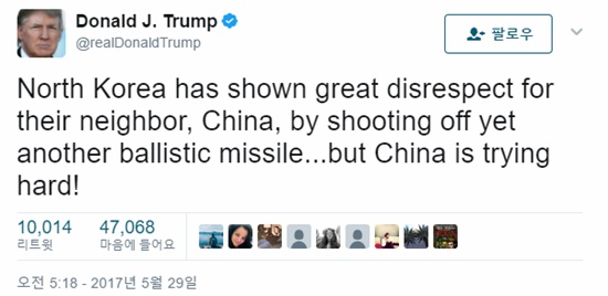 이날 트위터에 올린 글에서, 트럼프 대통령은 “북한이 또다른 미사일을 발사함으로써 이웃나라 중국에 큰 결례를 범했다”고 비난했다. “그러나 중국은 열심히 노력하고 있다”고 덧붙였다.