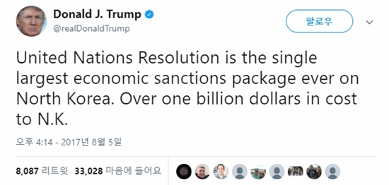 니키 헤일리 유엔 주재 미국 대사는 “우리 세대에 어떤 나라에 대한 가장 혹독한 제재”라고 자평했다. 트럼프 대통령은 트럼프 대통령은 “유엔 결의는 북한에 대한 가장 포괄적인 경제 재재”라며 “북한에 10억 달러 이상의 비용”을 안겼다고 밝혔다.