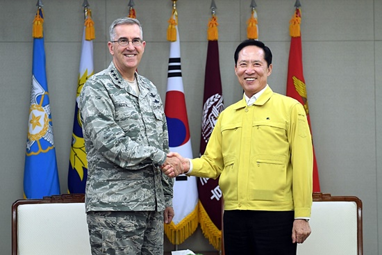 송영무 국방장관은 이날 서울 용산구 국방부 청사에서 방한 중인 존 하이튼 미 전략사령관을 접견했다. "엄중한 한반도 안보상황 하에서 북한 핵.미사일 위협을 억제하고 효과적으로 대응하기 위한 한.미 전략적 공조방안에 대해 논의했다"고 국방부는 설명했다.