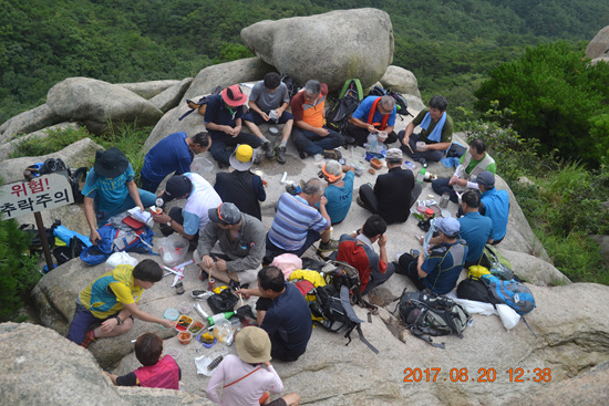 최영 장군이 자신의 활 솜씨를 가늠하기 위해 자신의 활과 애마 중 누가 더 빠른 지를 시험해 봤다는 활터에 올랐다. 잘 지어진 정자가 있어 그 곳에서 준비해온 막걸리와 수육, 그리고 목이버섯 장아찌로 휴식을 즐겼다. 이곳에 오르는 동안 우리는 이번 산행은 하늘이 허락한 ‘6.15 산악회 10주년 기념 산행’임을 알았다.