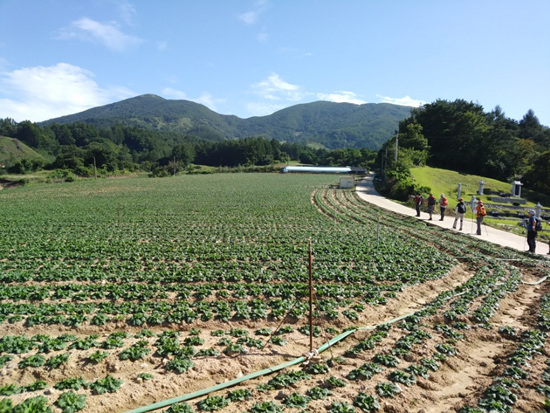 소사마을 입구에서 단체사진을 찍고 초점산을 향해 다시 걷기 시작이다. 대로를 건너니 초점산 이정표가 있다. 길을 오르니 한쪽은 고랭지 배추밭, 다른 쪽은 마을. 콘크리트길을 지나고, 사과농장, 마을을 지나니 백두대간 마루금 대덕산 이정표가 나온다.