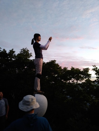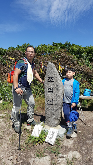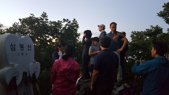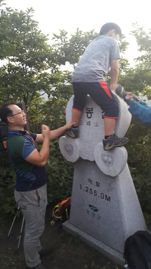 더 감동적인 일출 장면을 담으려 사과모양 정상석에 오르는 대원이 있는가 하면 각자 사진작가가 되어 멋진 광경을 담으려 여기저기 찰칵찰칵. 어른들 사이에서 까치발을 하고 민성이도 핸드폰을 열심히 누른다. 또 호기심 발동하여 아빠의 도움으로 정상석에 오르더니 우와~ 감탄사 연발.
