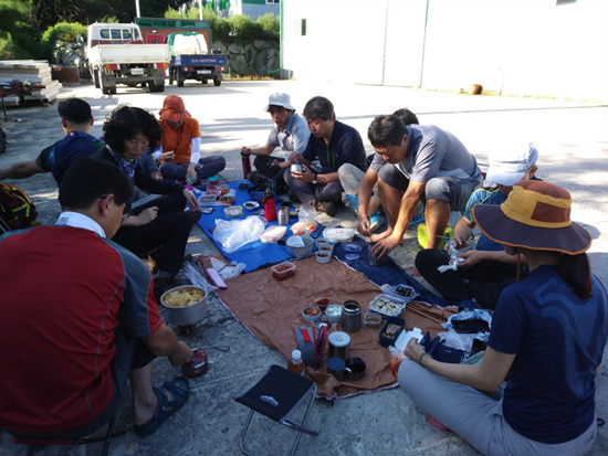 소사마을 입구 마당에 둥그렇게 앉았다. 오늘도 푸짐한 밥상, 인기 메뉴는 콩나물과 어묵을 넣은 퓨전요리 전씨네 라면. 반주도 한잔씩 하고 마지막 커피로 입가심. 다시 짐 정리하고 탑선슈퍼에서 초점산 정상에서 마실 막걸리 사는 것도 잊지 않고 챙긴다, 날은 서서히 더워지기 시작한다.
