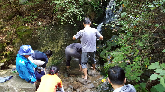 배낭을 팽개치고 발을 담근다. 30초도 참기 힘들 정도로 차다. 땀에 절은 몸과 피로를 한방에 날리는, 이름 그대로 얼음폭포다. 대원들 모두 생기발랄 콧노래가 절로 나온다.