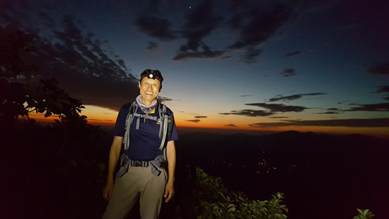 어둠이 서서히 걷히고 산봉우리들이 모습을 드러내기 시작하나 일출까지는 30분 정도 기다려야 한다, 돌아가며 정상석에서 인증삿을 찍고, 정상에선 빼놓을 수 없는 정상주도 한잔씩, 5시 55분 여명이 밝아오고 산봉우리들 사이로 둥근 해가 조금씩 올라온다.