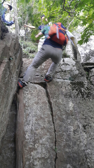 다시 봉우리를 넘고, 바위를 돌아가니 덕유산 할미봉 하산길보다 더 까다로운 직벽이 나타났다. 먼저 민성이가 놀란다. 유병창 대원이 먼저 내려가 민성이를 받아 내리고, 한 사람씩 밧줄을 잡고 엉덩이를 뒤로 빼고 마치 암벽 등반하듯 조심조심 모두 무사히 내려왔다.