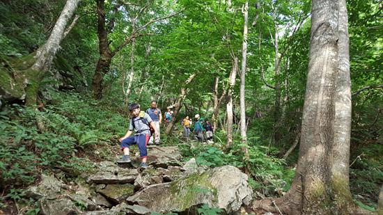 한참을 걷고 있는데 갑자기 민성이가 ‘앗 따가워’ 하며 울기 시작한다. 뒤 따라 오던 민성아빠가 뛰어와 민성이를 안고 10미터를 뛰어 내려간다. 다들 긴장하는 분위기. 민성이가 벌에 쏘였다.