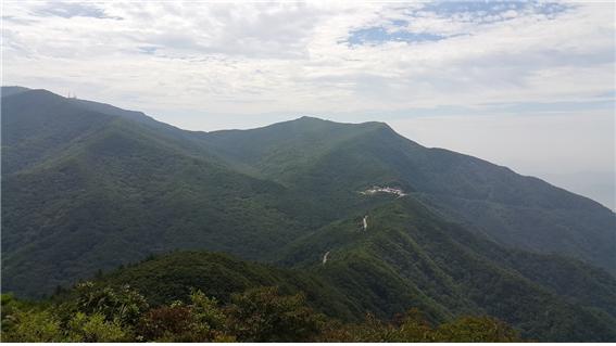 만복대 탐방로 입구를 지나 산죽으로 우거진 산길을 따라 오르다 보면 뒤로 성삼재에서부터 걸어 온 능선길과 그 뒤로 종석대와 노고단이 시야에 들어옵니다.
