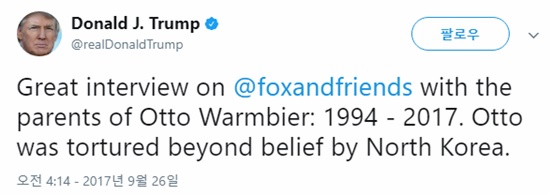 트럼프 대통령은 이날 트윗을 통해 북한에 억류됐다가 풀려난 직후 사망한 오토 웜비어 씨의 부모와 <폭스TV>의 인터뷰를 봤다며 “오토 웜비어는 북한에 의해 믿을 수 없을 만큼 고문당했다”고 비난했다. 헤더 노어트 국무부 대변인은 ‘고문 여부’에 대해 “확인하지 않겠다”면서도 “웜비어에게 일어난 일이 끔찍하다는 점은 분명하다”고 말했다.