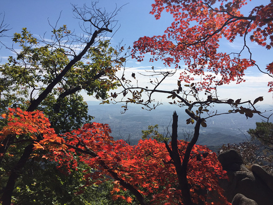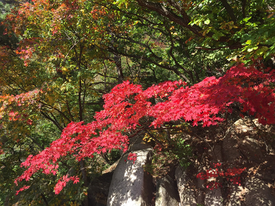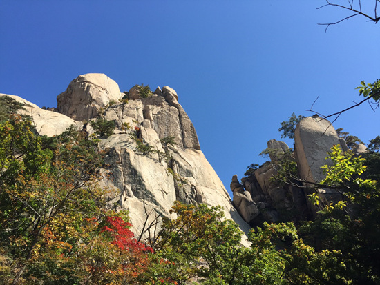 계단을 오르는 왼쪽으로 신선대가 자리하고 있으며, 오른쪽으로 자운봉이 있는데 많은 계단들 주위의 고목들에서 붉은 단풍잎들이 자기 자태를 마음껏 뽐내며 우리를 반겨 맞아 주었다.