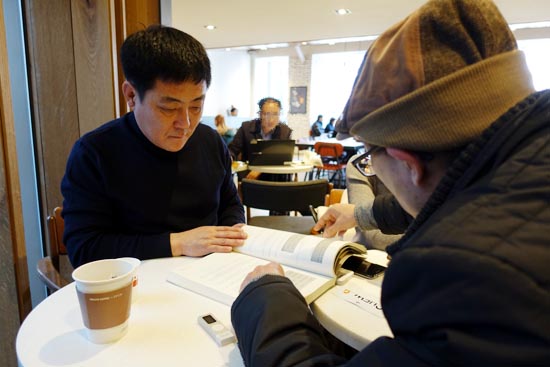 ▲ 'KAL858기 사건 진상규명 시민대책위원회' 조사팀장인 서현우 작가와 김현희 씨 자필 자료들을 검토하고 있는 홍강철 씨. [사진 - 통일뉴스 김치관 기자]
