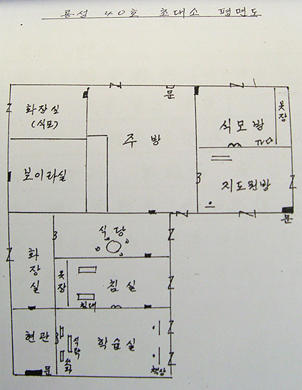▲ 김현희가 작성한 북한 룡성 40호 초대소 평면도. 그녀는 수많은 도면을 그렸고, 비치품 목록도 하나하나 꼼꼼히 기록해내 뛰어난 기억력의 소유자임을 보여줬다. 무기고는 보이지 않는다. [자료사진 - 통일뉴스]