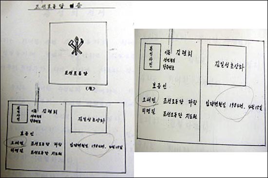 ▲ 김현희 씨가 직접 그린 조선노동당 당원증(왼쪽). 오른쪽 사진은 하단 부분을 확대한 것. 홍강철 씨는 초상화 위치 등이 맞지 않다고 지적했다. [자료사진 - 통일뉴스]