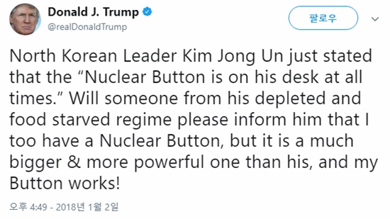 이날 트윗을 통해, 트럼프 대통령은 “북한 지도자 김정은이 (신년사에서) ”그의 책상 위에 항상 핵 단추가 놓여 있다“고 말했다”면서 “고갈되고 기아에 허덕이는 그 정권 내부 누군가가 그에게 ‘트럼프 역시 핵 단추가 있고 그의 단추보다 더 크고 강력하며 트럼프의 단추는 작동한다!’고 말해주라”고 비아냥거렸다.