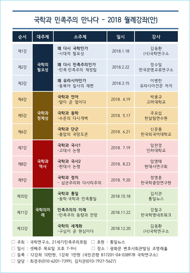 우리 사회에서 제대로 조명받지 못하고 있는 국학(國學)과 민족주의를 주제로 한 강좌가 오는 18일부터 매월 한 차례씩 진행된다.