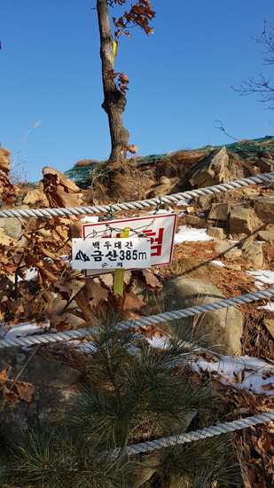 낙엽을 살짝 덮은 눈이 얼어붙어 미끄럽다. 아이젠을 할까 망설이다가 좀 더 걸어보기로 한다. 눈길을 30여분 내려오니 다시 오르막이다. 왼쪽으로 추풍령 저수지가 보이고 황토색 맨살을 드러낸 금산이 눈에 들어온다. 마음이 아리다.