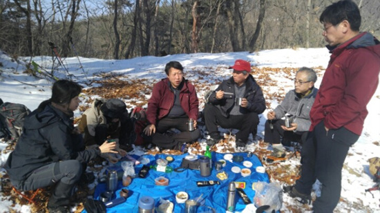 포근한 날씨에 바람도 없고, 갈 길은 짧고 시간은 넉넉하니 느긋한 점심에 웃음 만발. 날씨 하면 떠오르는 조한덕 대원. 오늘의 이 청초한 겨울 날씨는 조한덕, 민성 부자의 기도 덕분이라는 김성국 대원의 말에 모두 동의를 표한다.