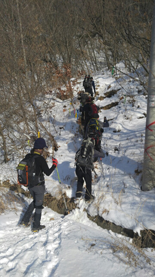 아이젠을 착용하고 걷다보니 아이젠에 눈이 뭉쳐서 걷기가 여간 불편한 게 아니다. 대원들은 수시로 뭉친 눈을 털기에 바쁘다. 등산화 바닥에 눌러 붙어 계속 성가시게 구는 눈을 털다 걷다보니 어느덧 사기점 고개에 도착했다.
