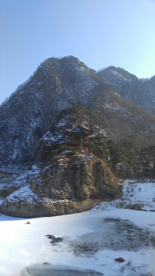 차에서 내리자 대원들 모두 감탄한다. 이렇게 아름다운 비경이 지금까지 알려지지 않았다는 것에 의아해 하며. 깎아지른 듯한 절벽에 세워진 정자 월류정, 낮게 눈을 이고 있는 다섯 개 봉우리, 기가 막힌 절경이다.