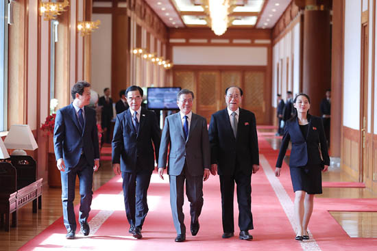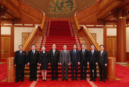 김의겸 청와대 대변인은 “문재인 대통령은 오늘 김정은 국무위원장의 특사 자격으로 방한한 김여정 조선노동당 중앙위원회 제1부부장과 평창 동계올림픽 고위급 대표단장인 김영남 최고인민회의 상임위원회 위원장을 만났다”고 밝혔다.
