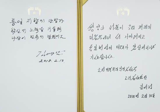 김여정 특사는 김정은 국무위원장의 남북관계 개선 의지를 담은 친서를 전달하면서 “문재인 대통령을 빠른 시일 안에 만날 용의가 있다. 편하신 시간에 북을 방문해 주실 것을 요청한다”는 김정은 국무위원장의 초청 의사를 구두로 전달했다. 김 특사는 청와대 본관 접견실에 들어올 때 ‘김정은 친서’로 보이는 파란색 파일철을 지참했다.