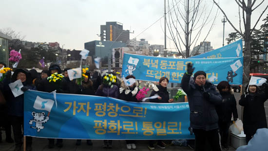 ▲ 삼지연관현악단 서울공연이 열린 11일 오후 동대입구역 근처에서 시민들이 단일기와 현수막을 들고 나와 환영하고 있다. [독자사진 - 통일뉴스]