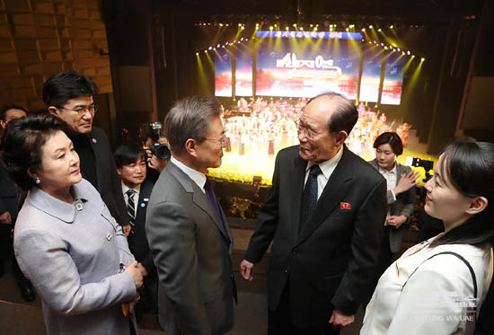 북한 김영남 최고인민회의 상임위원장과 김정은 국무위원장의 특사인 김여정 조선로동당 제1부부장 등 고위급대표단은 이날 오후 7시 국립중앙극장 해오름극장에서 열린 삼지연관현악단 서울공연 관람에 나서 문재인 대통령과 다시 만났다