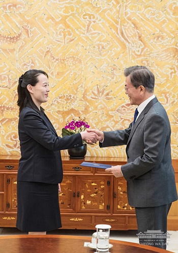 2월 10일 오전 11시 청와대. 북측 고위급대표단이 본관에 도착하자, 임종석 대통령 비서실장이 마중을 나왔다. 그리고 현관에서 문재인 대통령이 이들을 맞았다. “추운 날씨에 밤늦게 고생 많으셨다”고 문 대통령이 인사하자, “대통령께서 마음을 많이 써주셔서 괜찮았다”고 김 제1부부장이 화답했다.