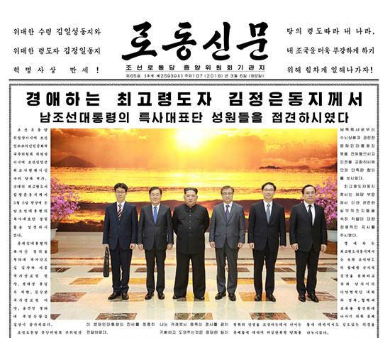 <노동신문>은 6일 1, 2면에 '경애하는 최고령도자 김정은동지께서 남조선대통령의 특사대표단성원들을 접견하시었다'는 제목으로 특사단과 기념촬영한 사진, 회담 사진, 만찬 사진을 게재하고 회담 내용에 대해 보도했다.