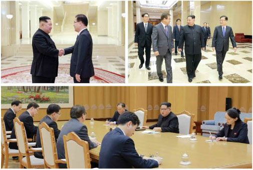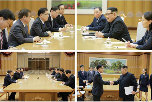 이날 "문재인대통령 특사대표단 사이의 담화는 동포애적이며 진지한 분위기속에서 진행되었"으며, 회담이 끝난 후에는 특사대표단 관계자들과 함께 기념사진을 찍었다. 북측에서는 김영철 당 부위원장과 김여정 당 제1부부장이 참가했다고 덧붙였다.