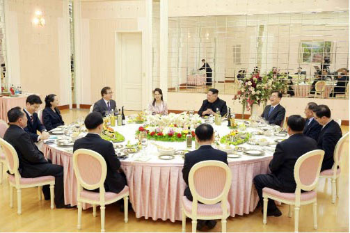 원형 만찬 테이블 가운데 김 위원장과 리설주 여사가 앉고 김 위원장의 왼쪽에 정의용 실장, 김영철 당 부위원장이, 리 여사의 오른쪽으로는 서훈 국정원장과 김여정 당 제1부부장이 자리를 했으며, 리선권 조국평화통일위원회 위원장 등의 모습도 보였다.