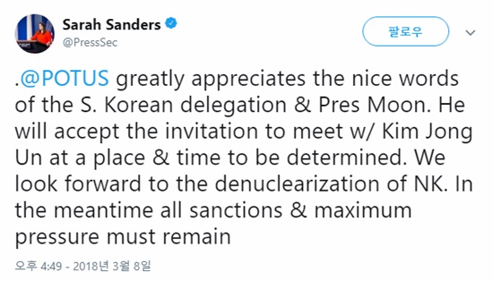 샌더스 대변인은 트위터에 올린 성명을 통해 “트럼프 대통령은 한국 대표단과 문재인 대통령의 좋은 말에 매우 감사해 한다”면서 이같이 밝혔다. 김정은 북한 국무위원장이 트럼프 대통령을 초청했고, 트럼프 대통령이 5월 안에 만날 것이라고 화답했다는 정의용 청와대 국가안보실장의 발표를 확인한 것이다.