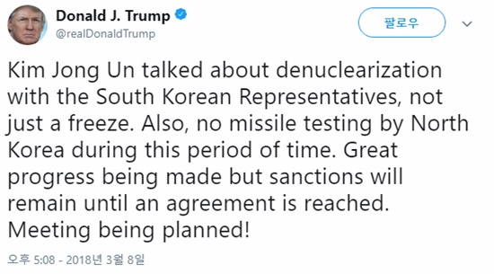 도널드 트럼프 미국 대통령이 8일(현지시간) “(김정은과의) 만남이 계획됐다!”고 알렸다.