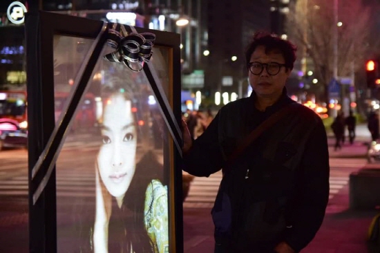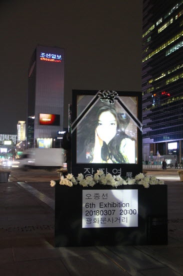 '오종선 6th Exhibition 20180307 20:00 광화문사거리'라는 전시 설명이 붙어 있는 장자연 씨의 영정사진 저 너머로 코리아나 호텔 벽면에 흰색과 빨간색으로 빛나는 '조선일보 Chosun.com' 네온이 선명하다.