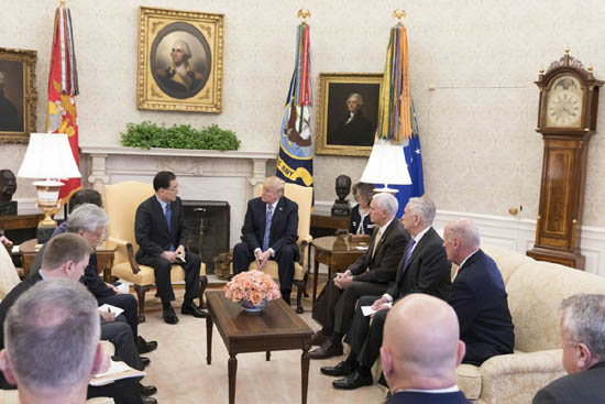대북 특사단 수석특사로 김정은 국무위원장을 만나고 온 정의용 청와대 국가안보실장과 서훈 국가정보원장은 8일 오후(이하 현지시간) 백악관 오벌 오피스에서 트럼프 대통령을 만나 김정은 위원장의 “가능한 조기에 만나고 싶다는 뜻”을 전했고, “트럼프 대통령은 굉장히 수긍하며 그 자리에서 좋다, 만나겠다, 바로 수락했다”는 것.