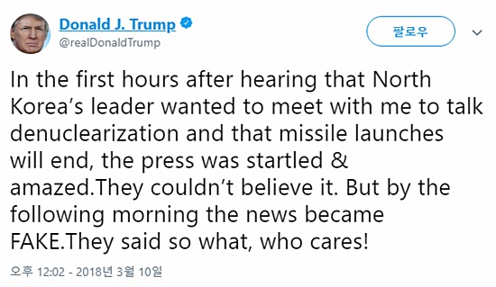 하루 전인 9일자 트윗을 통해서는 성공적으로 준비되는 북한과의 협상이 “완수되면 세계를 위해 매우 좋은 일”이라며 “(북미정상회담의) 시간과 장소가 결정될 것”이라고 밝혔다.