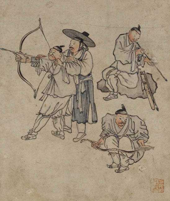 이 그림에서 활쏘기를 배우는 사람들은 선비라고 특정할 수 없다. 교관이 있는 것으로 보아 군사훈련을 받는 농민일 가능성이 높다. 이 그림에는 낙관이 오른쪽 하단에 찍혀있지만 공간의 방향은 왼쪽으로 향하고 있다. 교관이 활쏘기를 가르치고 있는 모습인데 활을 쏘는 사람은 왼손잡이다. 오른손잡이로 그리면 얼굴이 가려지기 때문이다. [자료사진 - 심규섭]