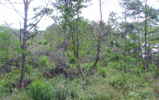 차는 북당골을 향해서 구불구불 감돌아갔다. 분명하게 기억하고 있는 곳인데 지나쳐 버렸다. 다시 내려와서 대판리로 가는 길목에 차를 세웠다. 보는 것이 달라지면 조금은 떨떨한 법이다. 나무가 울창할 때 두 번 와본 곳이다. 눈앞에 나무를 다 베어버린 속살을 드러낸 산이었다. 길가에 바위를 표적으로 기억하고 있기 때문에 틀림없다. 왼쪽으로 난 가파른 골짜기를 타고 갔다. 15~6미터 올라가서 오른쪽으로 4~5미터 올라가면 평평한 곳이 나온다.