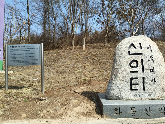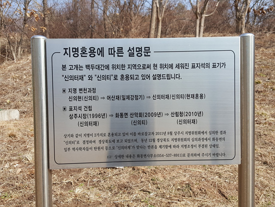 ‘신의터재’란 이름이 궁금하다. 아니나 다를까 ‘지명혼용에 따른 설명문’이 큰 표지판에 적혀 있다. 좀 자세히 나와 있는 다른 표지판에 의하면, “신의터재는 임진왜란 이전 신은현(新恩峴)이라 불렸던 고개로 임진왜란 때 최초의 의병장이었던 김준신이 의병을 모아 큰 공을 세우고 임진년 순절한 후부터 신의터재라 불렸으며, ‘지방의 관리나 귀양중인 옛 벼슬아치들이 나랏님(御)으로부터 승진, 또는 복직 등 좋은 소식(義信)이 오기를 기다리던 고개’였다는 사연이 전해지는 고개”라면서, 이어 “그러나 일제강점기 때 민족정기를 말살한다고 ‘어신재’로 개명되었으나 광복 50주년을 맞아 옛 이름을 되찾은 사연 많은 고개”라고 적시되어 있다. 굳이 공자의 정명론(正名論)을 꺼내지 않더라도 ‘이름을 바로잡는 일’(正名)이나, 잃어버린 이름을 되찾는 건 중요하다.