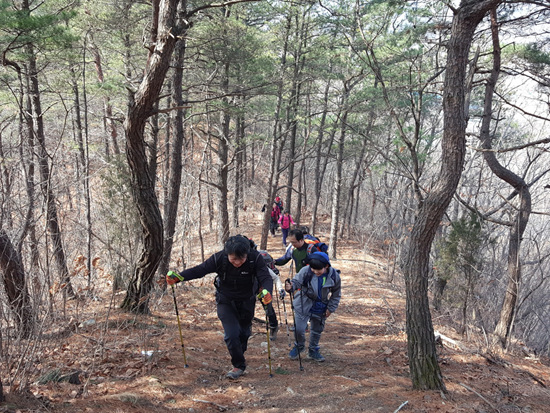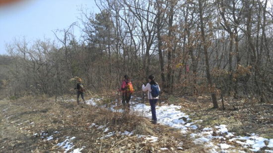 야트막한 야산 10여 개를 넘으면 됐다. 산행은 주로 능선으로 이어졌다. 능선을 타고 오르락내리락 하니 임도도 몇 차례 건넜다. 임도와 만난다는 건 산이 낮다는 것이다. 능선을 타니 좌우로 마을과 밭이 보이고 조금 멀리 높은 산들이 지나갔다. 특히 낮은 산만을 연이어 탔다는 건 우리가 지나는 길에 자주 마주친 무덤들이 말해준다. 우리가 지나는 능선 길옆 양지 바른 곳에 무덤들이 꼭 있었다. 가끔 대간길이 아니라 소풍 길을 걷는 기분이었다. 이른 봄에 동산을 걷는 것 말이다. 누군가 말했다. “백두대간 길에 이렇게 쉬운 길이 있었네.”