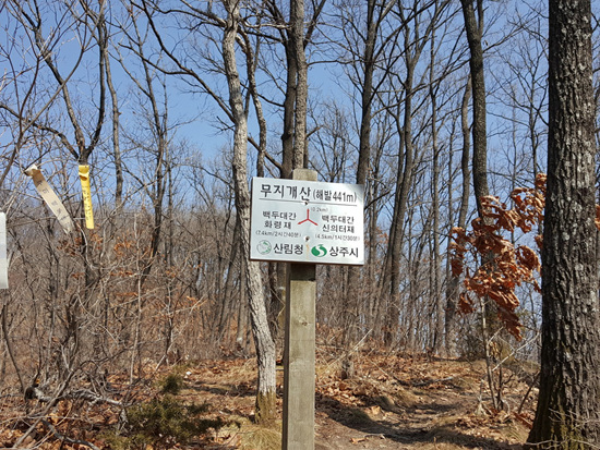 이번 산행 코스는 지기재~신의터재~무지개산~윤지미산~화령재이다. 전체 15.6Km, 식사 및 휴식시간 포함해서 8시간으로 잡았다. 이 구간은 추풍령에서 시작된 중화지구의 마지막 구간이다. 결론부터 밝힌다면 들머리인 지기재를 오전 9시 30분에 출발해 날머리인 화령재에 오후 4시 30분에 도착했다. 모두 걸린 시간은 7시간. 예상시간보다 1시간을 앞당겼다. 물론 빨리 가는 게 능사는 아니다. 하지만 1년 정도 타니 대원들의 산행 솜씨가 발전한 것도 자랑이다. 게다가 산행길도 우리의 속도를 도왔다. 한마디로 난이도가 무척 쉬웠다.