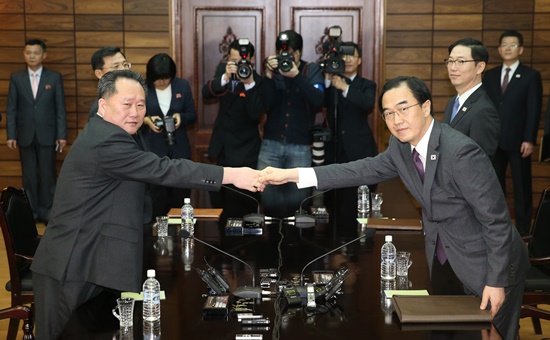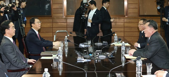 리 단장이 “오시느라 수고하셨습니다” 인사를 건네자 조명균 수석대표가 “평양에서 내려오는 길은 편안하셨습니까”라고 화답했다.
