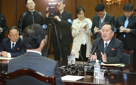 조명균 : (물 한잔 따라서 마심) 예 오늘 이렇게 저희 남측의 대표단을 우리 리선권 위원장을 비롯해서 북측 대표단이 따뜻하게 맞이해주셔서 감사합니다. 지금 우리 리선권 위원장께서 통일각에 대해서 상세하게 잘 설명해주셨는데 제가 가만히 들으면서 생각해보니까 지난번에 저희가 평화의집에서 회담을 했고 오늘 또 통일각에서 회담을 합니다. 그래서 평화와 통일이 이렇게 연결되는 좋은 의미가 그 자체에서 있지 않겠는가 생각을 해봤습니다. 그러한 이름에 걸맞게 연결되는 그런 의미에 걸맞게 저희가 잘 협의해서 우리 내외에 모든 사람들이 기대하는 그런 성과를 잘 내야되겠다 이렇게 다시 한번 마음을 먹었습니다. 그리고 오면서 이제 가만히 지난번 1월 9일날 우리가 1차 남북 고위급 회담을 할 때를 생각해봤습니다. 그때 제가 드린 말씀이 우리가 첫술에 배가 부르랴 또 시작이 반이다 이런 말씀을 드렸습니다. 그때 1월 9일 이후로 지금까지 3개월이 채 안되는 기간입니다만 이 기간 중에 진행된 여러 가지 남북간의 일들을 보게 되면 시작이 반이다는 말 이상의 좋은 성과들이 많이 있었습니다. 특히 이 자리를 빌어서 제가 말씀드리고 싶은 것은 우리 평창동계 올림픽 패럴림픽에 우리 북측에서 고위급 대표단을 비롯해서 선수단 응원단 예술단 많은 분들이 다녀가셨는데 저희가 보면서 느낀 것이 우리 북측 대표단이 모든 부문에 있어서 아주 성의있게 잘 준비를 해서 와서 저희 평창동계올림픽과 패럴림픽을 축하해주셨구나 하는 것을 저희 모든 사람들이 느꼈고 그런 점에 대해서 이 자리를 빌어가지고 그때 참여하신 분들 또 그걸 위해서 뒤에서 수고하신 모든 북측 분들에게 감사의 말씀을 전하고 싶습니다. 그리고 말씀드린 것처럼 저희가 시작이 반이다 해서 그 이상의 성과를 이미 내고 있습니다만 그러나 또 동시에 첫술이 배가 부르랴 하는 그런 초심 우리가 너무 또 많은 욕심을 부리기보다 하나 하나 차근 차근 이렇게 잘 해나가야 한다는 마음도 다시 한번 오면서 다짐을 했습니다. 말씀 하신 대로 저의 표정을 보고 오늘 회담 또 이렇게 전망을 읽으셨다고 하는데 이미 다 들킨 거 같습니다(웃음). 어쨌든 저희는 그런 마음을 갖고 왔습니다. 오늘 회담에서 저희가 그동안 진행된 것도 그렇고 오늘 회담도 그렇고 앞으로 진행되는 것들이 우리 북과 남의 최고지도자들의 어떤 결단에 의해서 우리가 이렇게 모든 것들이 펽쳐지고 있는 상황인만큼 예정된 남북 정상회담 수뇌 회담이 잘 성과있게 진행될 수 있도록 오늘 저희가 성의를 다해서 협의를 해야 되겠다 하는 그런 말씀도 다시 한번 드리고 싶습니다
