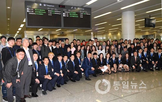 평양국제공항에 내린 공연단은 입국수속 뒤 기자단을 선두로 예술단, 태권도시범단 순으로 입국장으로 나왔다.