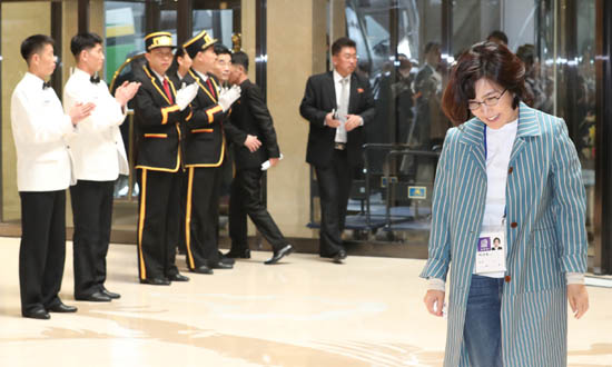 ▲ 가수 이선희 씨가 숙소인 고려호텔에 들어서자 호텔 직원들이 도열해 박수로 맞아주고 있다. [사진 - 평양공연 사진공동취재단]