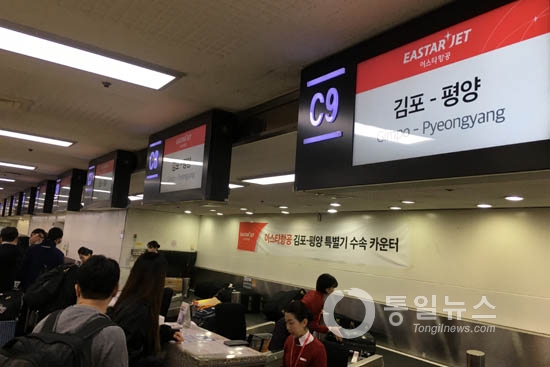 조용필, 이선희, 윤도현, 레드벨벳 등 유명 가수들이 포함된 ‘남북평화협력 기원 남측 예술단’ 본진 120명을 태우고 31일 김포에서 이륙한 이스타항공 ZE2815편 출발 시간과 목적지는 ‘10:30 평양’이다. ‘김포-평양’ 노선 알림판도 평양이 단번에 갈 수 있는 가까운 곳임을 보여준다.